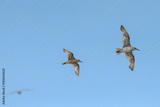 Image of two white birds in focus in flight and one white birds out of focus at back with blue sky background and copy space.