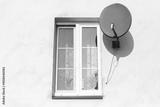 Home facade antenna background. TV satelite dish old house window. Countryside village architecture wall satellite dish. Television antenna mount. White paint house with mounted satellite.