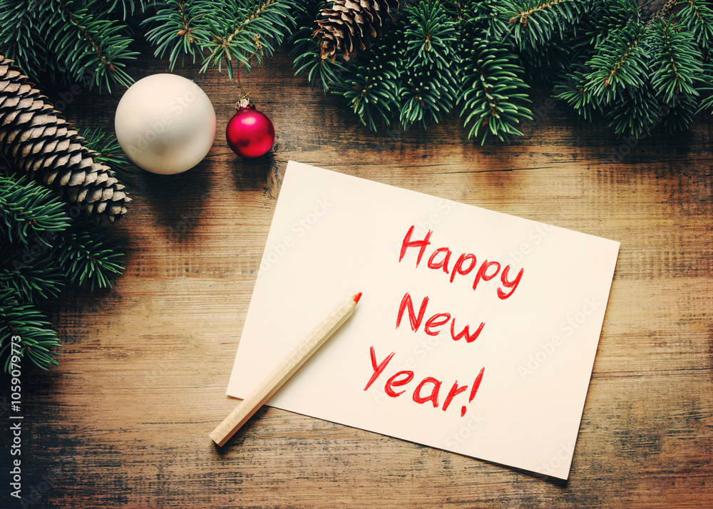 Happy New Year! - the inscription on the white postcard. Fir branches and balls on a wooden background, top view. Christmas winter background, Christmas card.