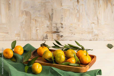 Fresh tangerines on a wooden table. Sweet winter citrus fruits.