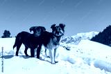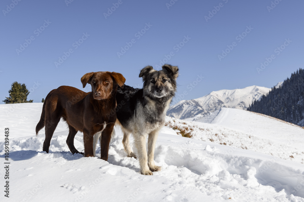 Two dogs stand in snow, looking at the camera. One is brown with a white chest mark, the other is gray, black, and white with a thick coat. Snowy mountains and a clear blue sky create a calm, wintery