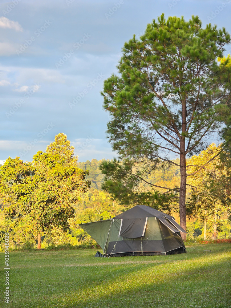 Tourist dome tent camping at forest camping site