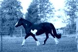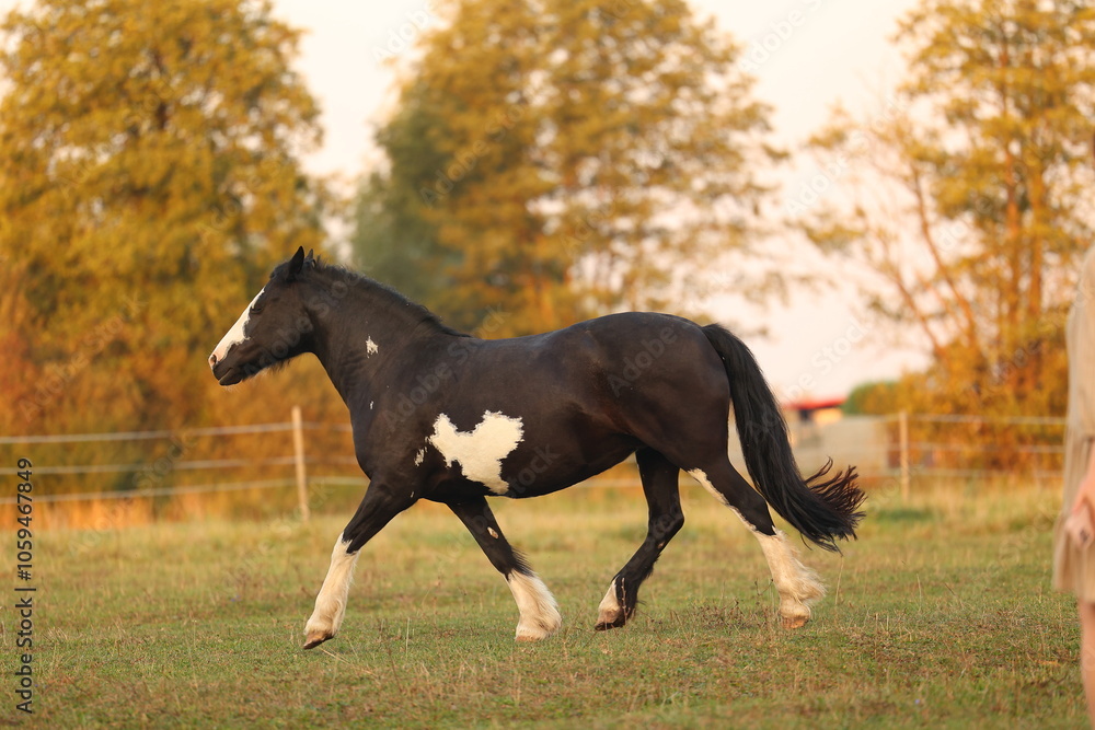 A beautiful horse walks in the meadow and eats grass