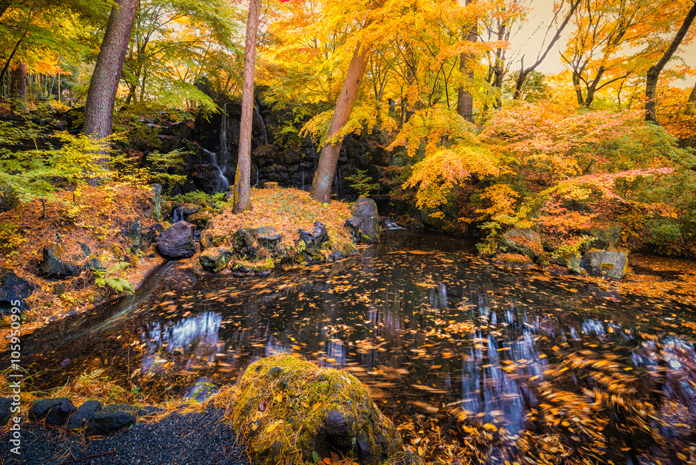 yellow maple leaves waterfall lake garden in autumn season