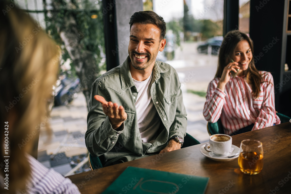 Happy friends drinking coffee and juices in a restaurant. Hanging out and having fun together.