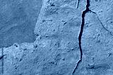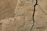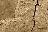 Crack in the concrete cladding of an old house. Rough, uneven surface. Cement plaster on a brick wall, texture, background. Ancient backdrop of yellowed color. Yellow, faded view of the wall cladding
