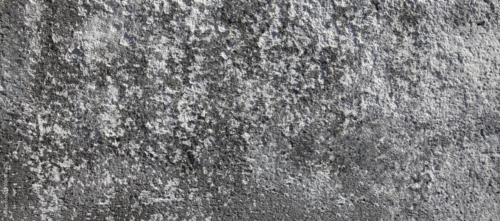 Grey concrete (cement) wall, background. The texture of the old fence with exfoliated and crumbled whitewash. Concrete surface with peeling white coating. Two-component (gray and white) backdrop