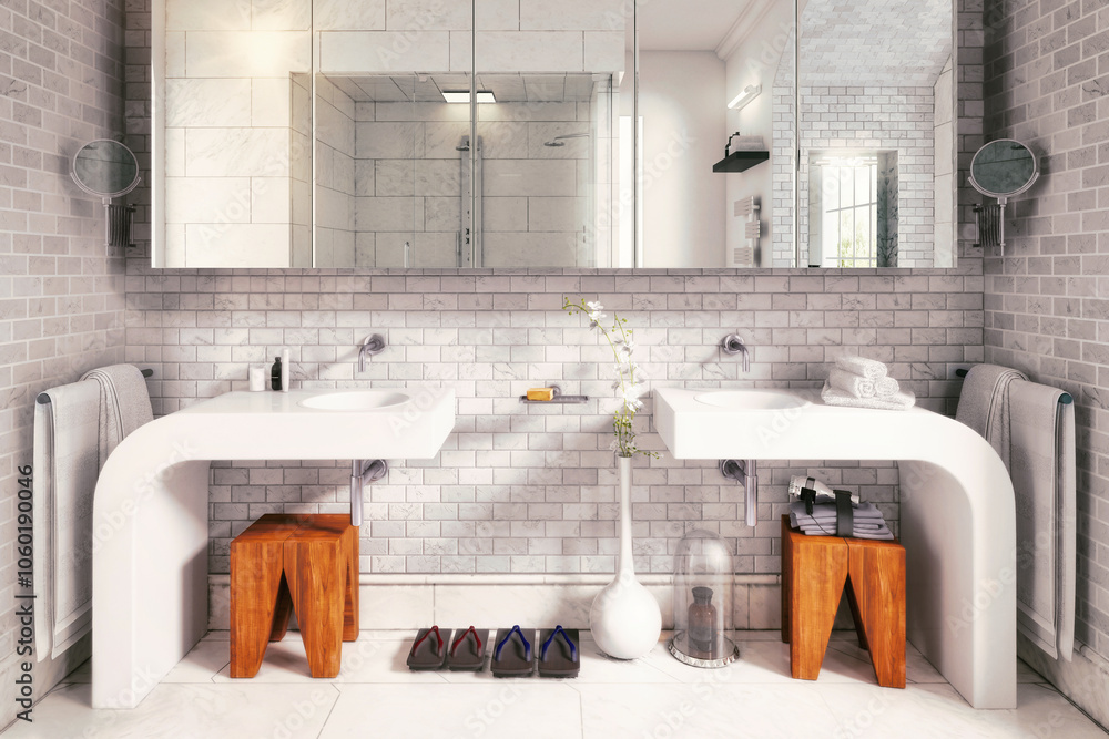 Modern bathroom in classical tiles design with sink, mirror and decor - 3d visualization