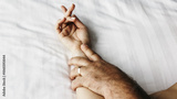 A close-up of a couple's hands intertwined on the bed, capturing a moment of relaxation and intimacy. This scene conveys the connection and pleasure in their loving relationship.