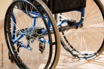 Close-up of a Wheelchair Wheel with Spokes Detail in a Sunny Environment