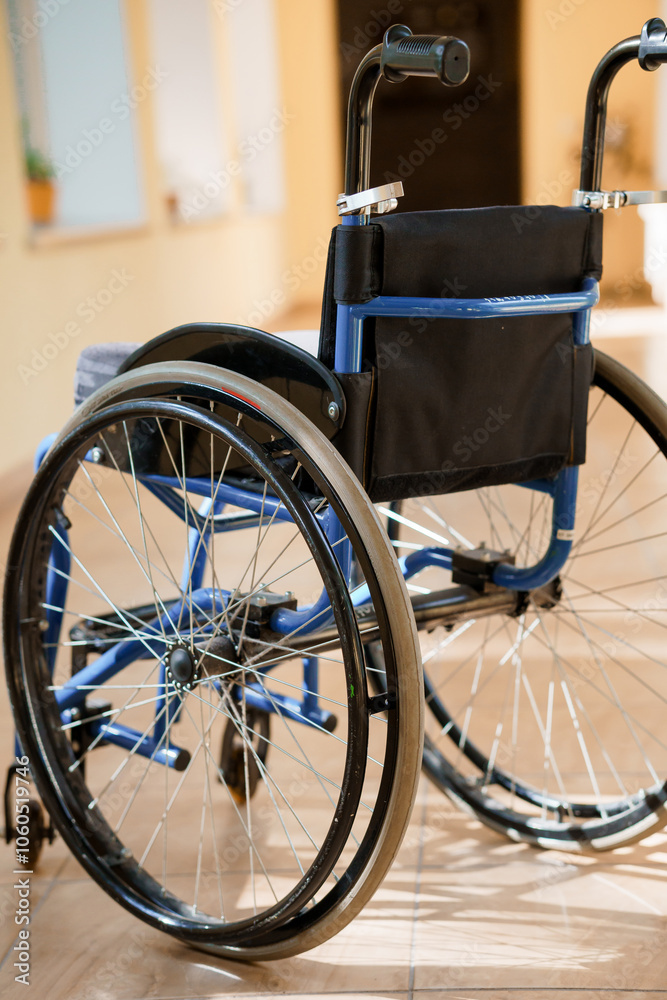 Blue Wheelchair Resting on a Sunlit Tile Floor