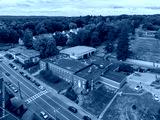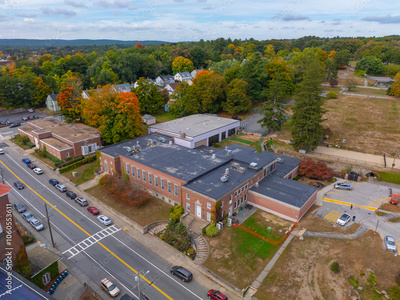 Whitin Community Center aerial view at 60 Main Street in fall with foliage in historic village of Whitinsville, town of Northbridge, Massachusetts MA, USA.