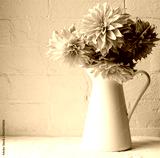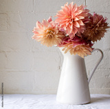 Coral pink dahlias in a white jug on a white tablecloth against a white brick wall