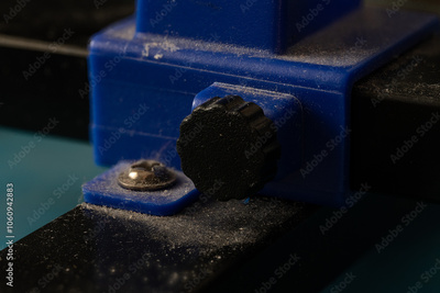 Close-up of a Blue Adjustment Knob on a Black Device with Dust Particles