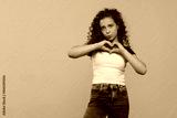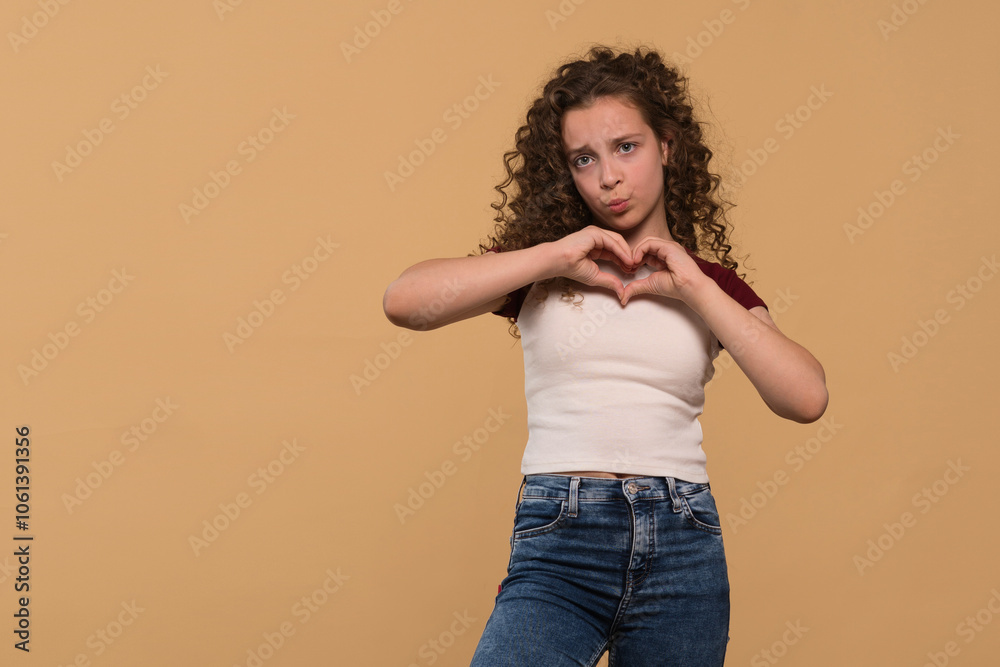A young girl making a heart gesture with her hands, expressing affection against a beige background