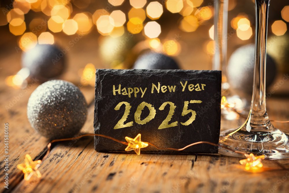 Happy New Year 2025 - Greeting Card - Black slate board with golden English text. Christmas decoration on rustic wood with Champagne glasses and golden lights from fireworks in background