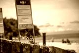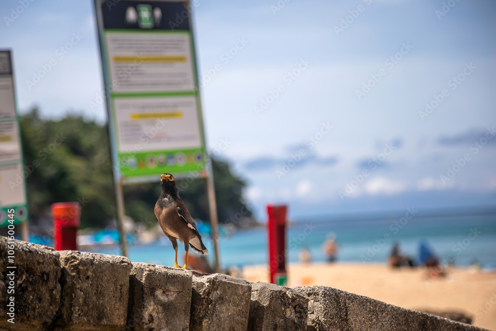 A large dove sits on the sand. Gray dove. Big and bold bird. Sunny day.