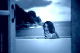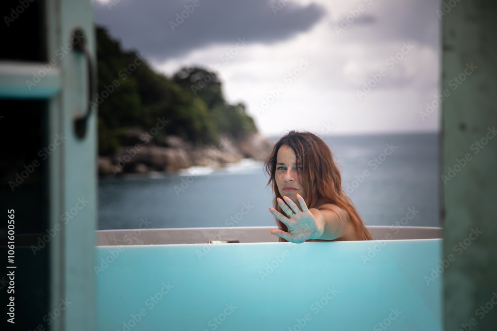Beautiful girl in the bath. Jungle and sky in the background. Girl with red hair.