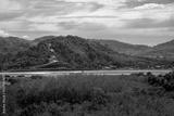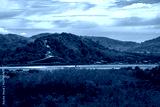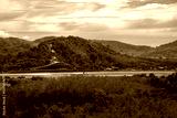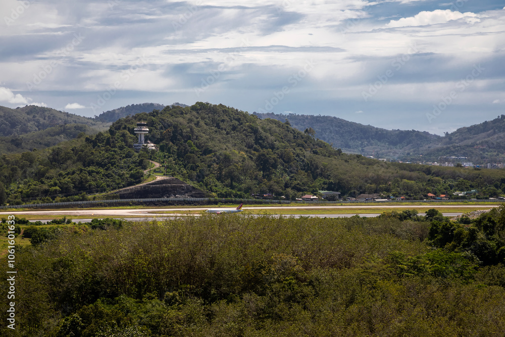 A beautiful small airport in the middle of the jungle. Clouds in the sky. Green trees. A plane on the runway.