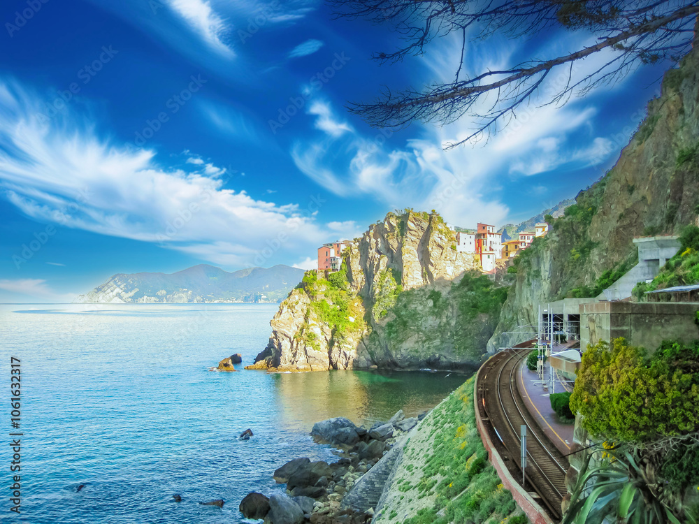 Train track is passing by a colorful Italian village overlooking the ligurian sea on a beautiful sunny day with blue skies and white clouds, in Cinque Terre National park