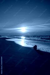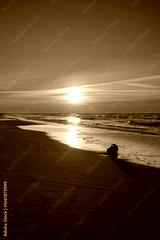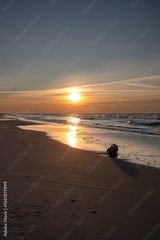 Sandy beach with the sun in the background. Beautiful sunset over the Baltic Sea in Gdynia, Poland.