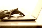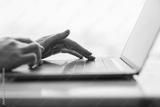 A detailed shot of a woman's hands typing on a cutting-edge laptop keyboard, set against a blurred office environment