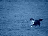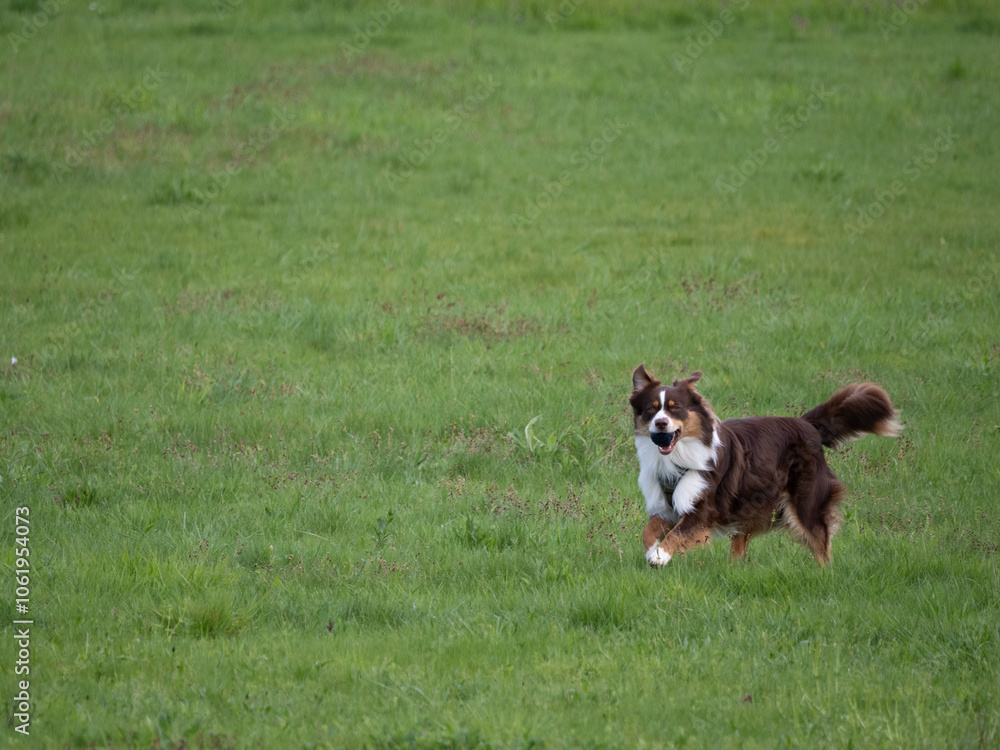 Perro muy peludo blanco y marrón grande corriendo por un prado verde