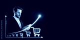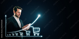 Businessman with Smartphone and Shopping Cart Growth Graph on Dark Background.