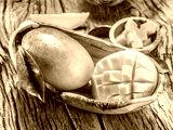 Mango fruit and mango cubes on the wooden table.