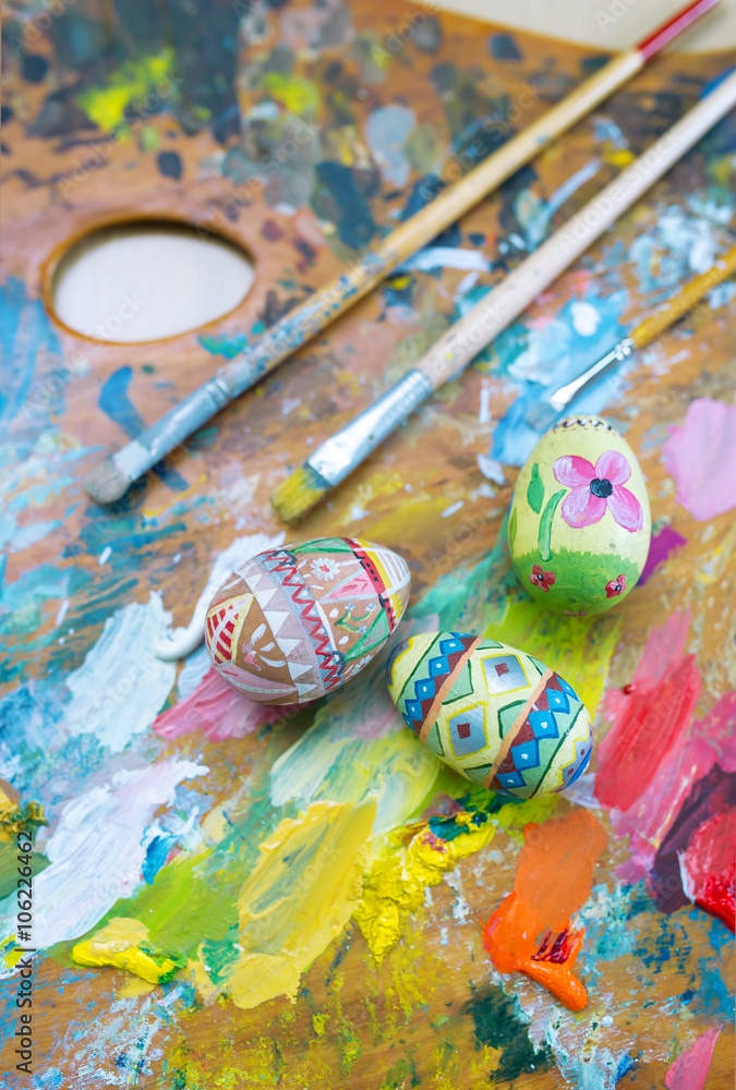 Paints, brushes and Easter eggs.