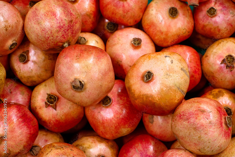 Ripe, juicy pomegranates on the counter at the food market. Background with pomegranates