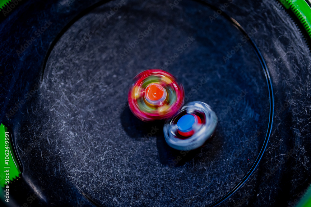 Beyblade battle of spinning toys in a fight of a Japanese origin game