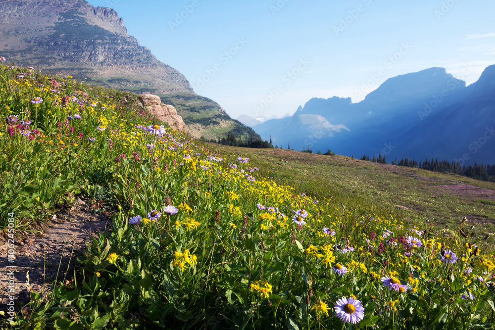 Flowering grasses on the mountainside in Glacier National Park in the early morning, Montana, USA