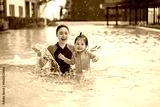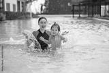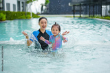 happy mother with her toddler baby girl playing water splashing in swimming pool