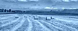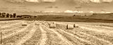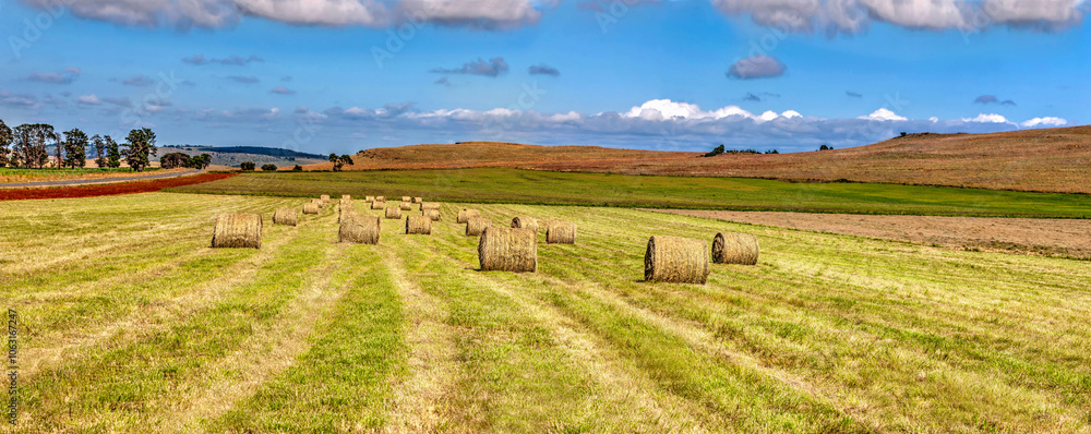 rolls bale of hay on a meadow, crop on a large farmland fields hills in the background sunny day