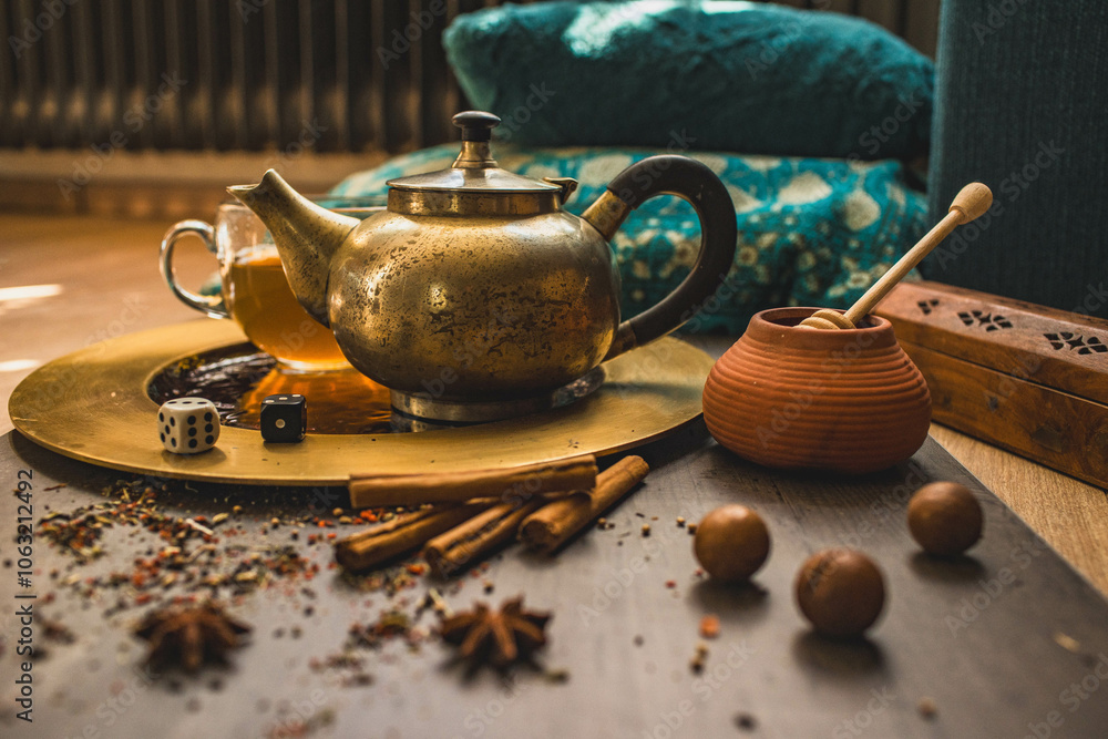 Tea ceremony, table with bronze teapot and species in a ceramic pot. Traditional food concept.