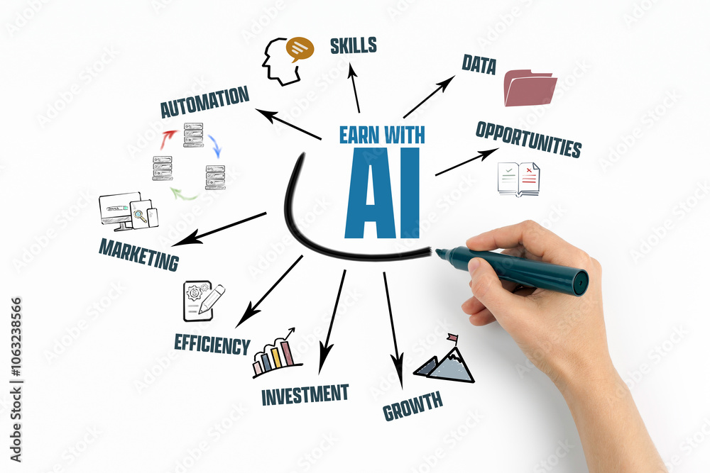 Earn With AI Concept. Chart with keywords and icons on white background