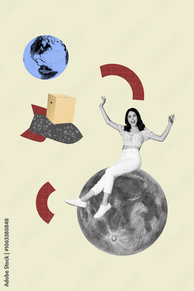 Composite trend artwork 3D sketch image photo collage of young woman sit moon planet earth racket delivery fly box service worldwide