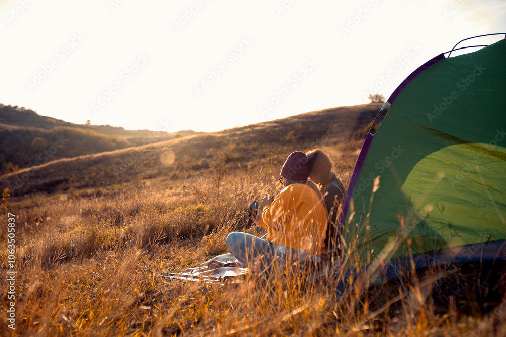 Two women camping at top of the hill sitting in front of the tent resting after hiking.