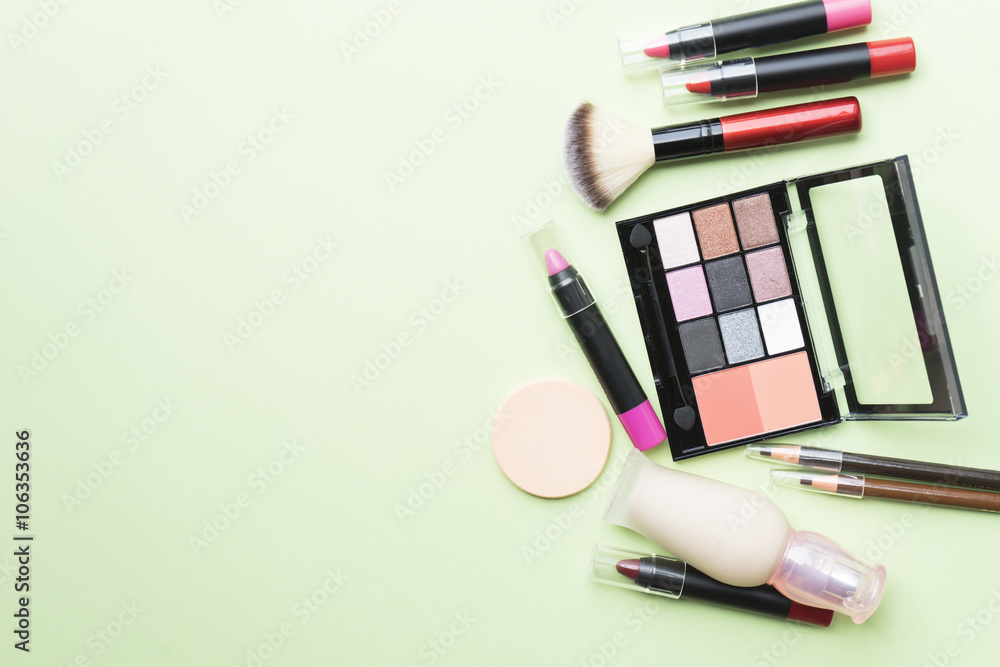 Set of colorful cosmetics on green background