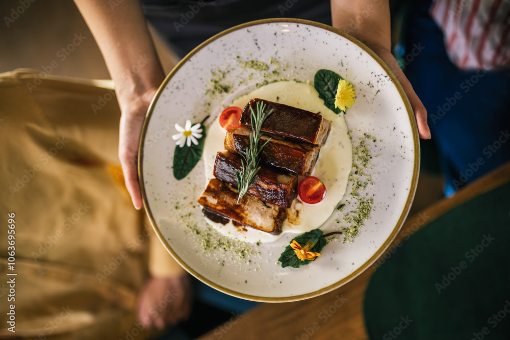 Grilled pork ribs with grilled sauce, spices, rosemary and cherry tomato.