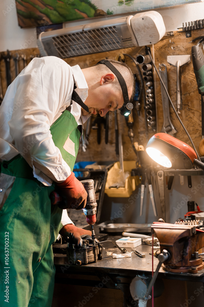 Skilled Craftsman Engaged in Precision Mechanical Work in a Well-Equipped Workshop