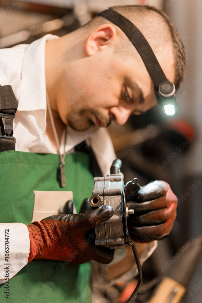 A Skilled Mechanic Performing Precision Work on Engine Components in a Workshop
