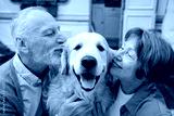Serene couple kissing dog golden retriever labrador, spending time together on traveling by trailer