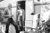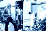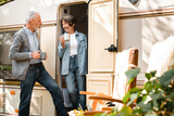 Active old senior elderly couple spouses husband and wife having breakfast on the porch of trailer