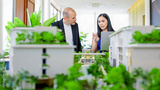 A manager consults with a client near a detailed model of a multi-story building, discussing options for purchase or rental. This scene highlights professionalism in real estate services.