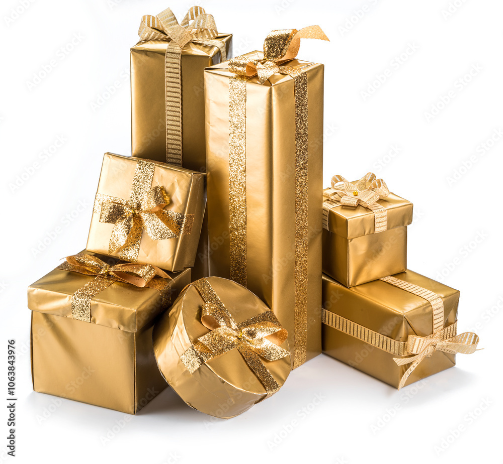 Golden gift boxes on white background. Symbol of happiness and holidays.