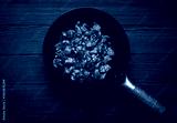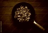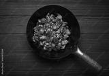 Wok pan containing Chinese kung pao chicken, a stir fried dish made with chicken, peanuts, vegetables and pepper, served on a wooden table