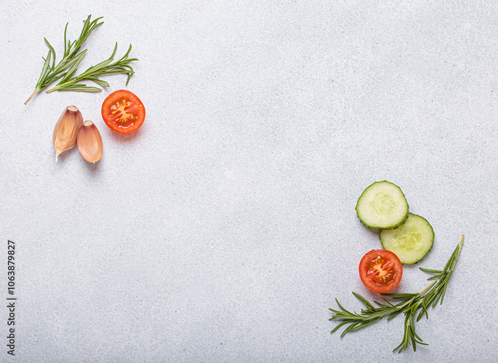 Freshly cut vegetables and herbs are framing an empty space on a grey background, a healthy and organic lifestyle, cooking concept