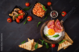 English breakfast - fried egg, beans, tomatoes, mushrooms, bacon and toast. Top view